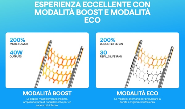 - BOOST: Le 2 mesh coil lavorano insieme, ampliando l'area di riscaldamento per un sapore più intenso
