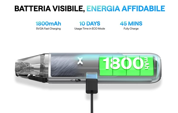 La ricarica completa della batteria avviene in soli 45 minuti e permette un utilizzo continuato in ECO Mode fino a 10 giorni