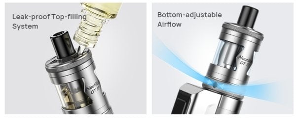 L'atomizzatore Nautilus GT II ha una capacità di 4,5ml con sistema di refill superiore, drip tip 510 intercambiabile e regolazione dell'aria tramite ghiera AFC inferiore.