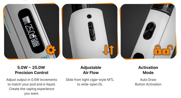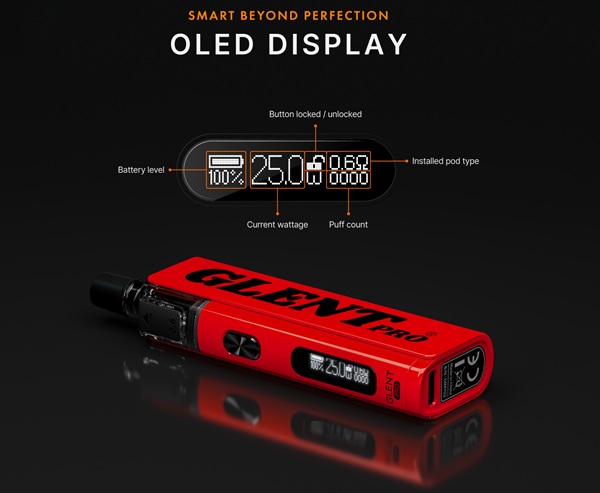 A differenza del modello precedente, la Glent Pro è dotata di un display OLED Display laterale intuitivo, permette di monitorare il livello di carica, il contatore dei puff e la resistenza in uso