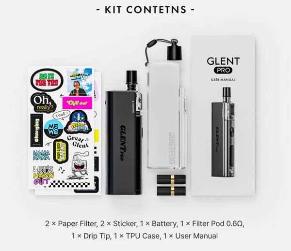 La confezione comprende 1 Glent Filter Pod (0,6Ω), 1 drip tip, 2 filtri in cotone, 2 sticker ed una cover in silicone