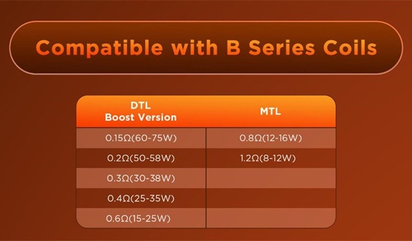 Compatibile con tutte le B Coil sia MTL (0,8-1,2 ohm) che DTL Boost Version (0,15-0,2-0,3-0,4-0,6 ohm)