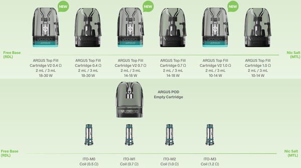 - Argus Top Fill V2 Pod da 0,7 ohm (14W-18W) per uno svapo di guancia (MTL) contrastato