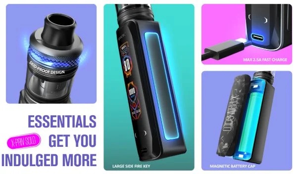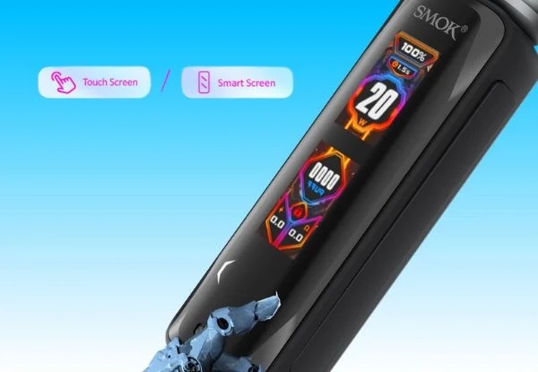 Smok X-Priv Solo Kit è dotata di un display touch screen che occupa l'intera parte frontale del device e di un tasto Fire di attivazione molto lungo posizionato sul lato destro della box